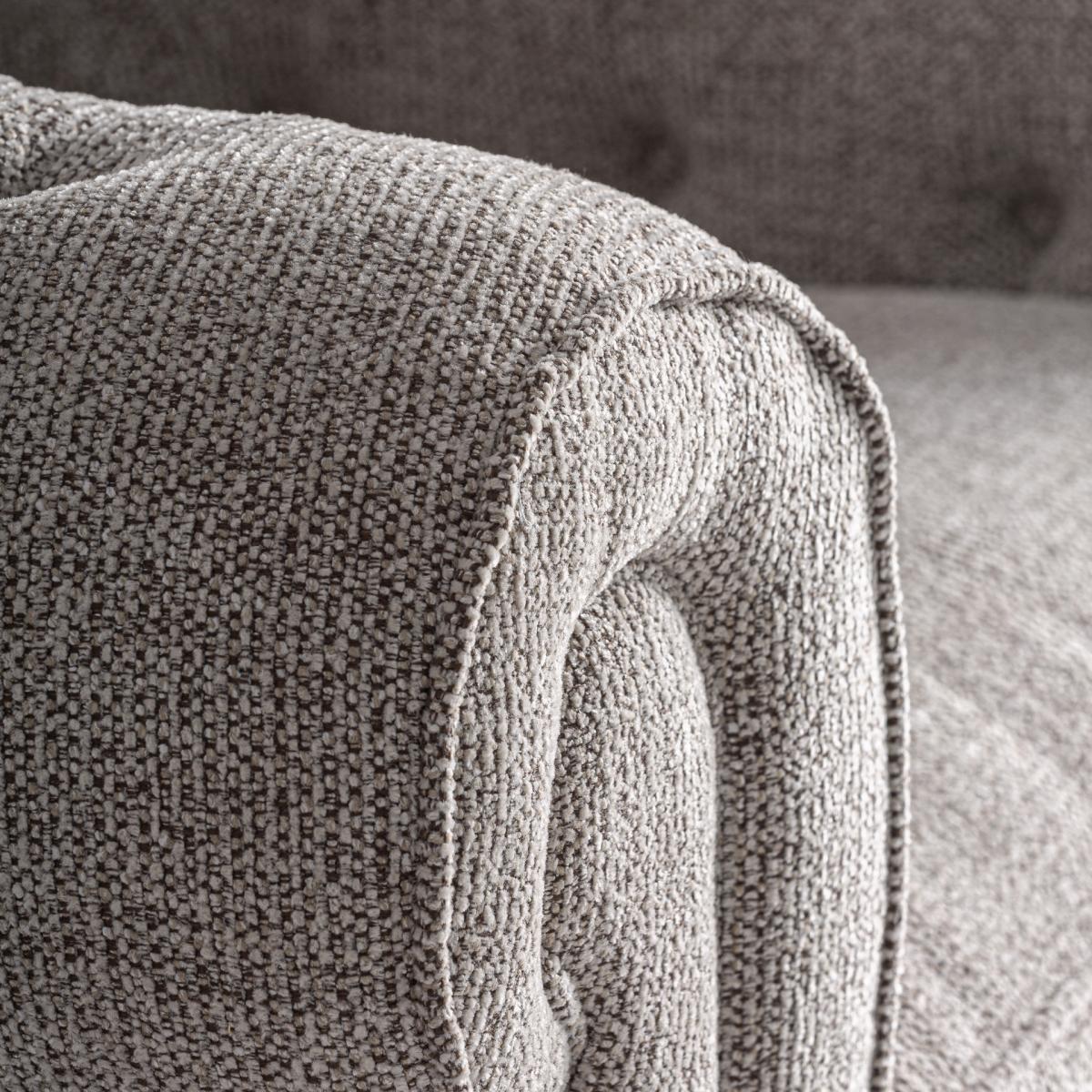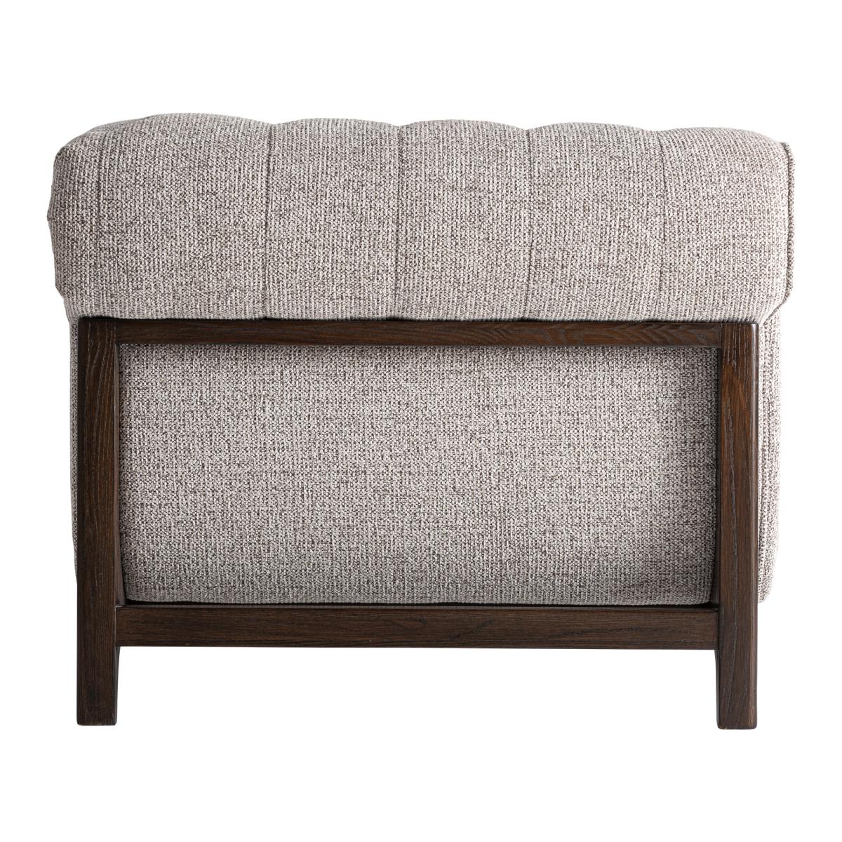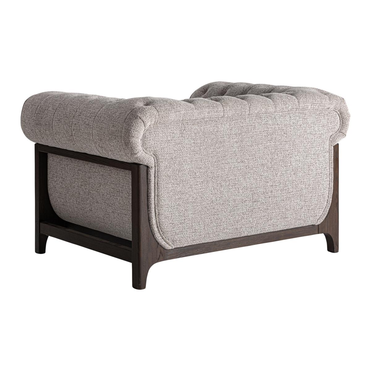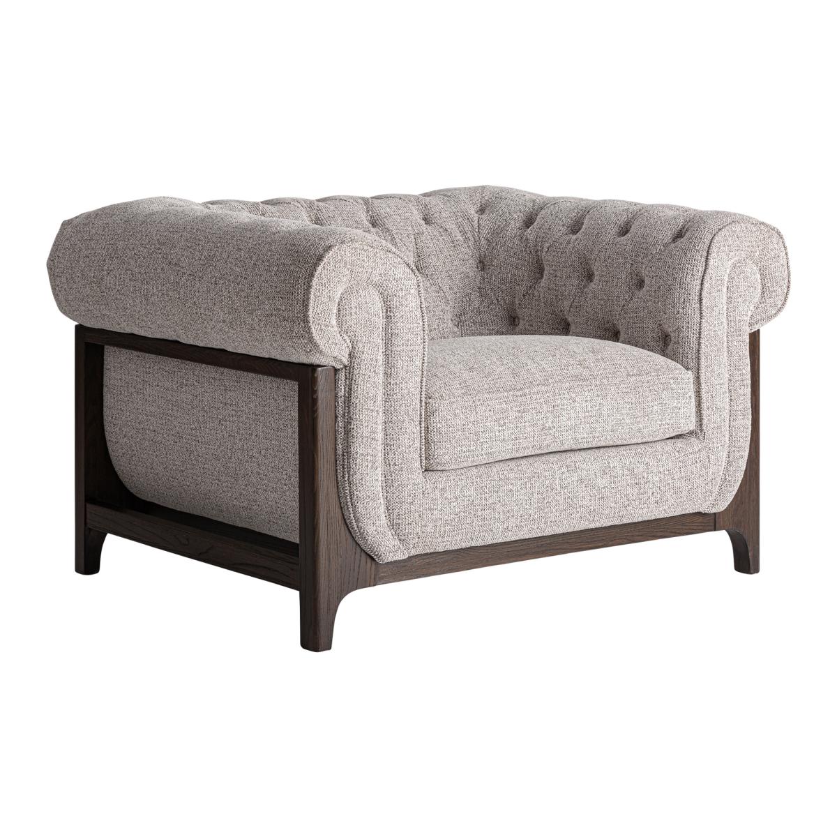 Sillón Ipswich de estilo clásico fabricado en madera de fresno en color marrón combinado con poliéster en color gris.