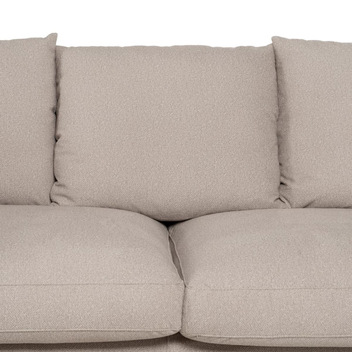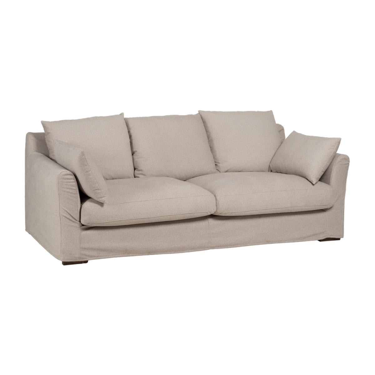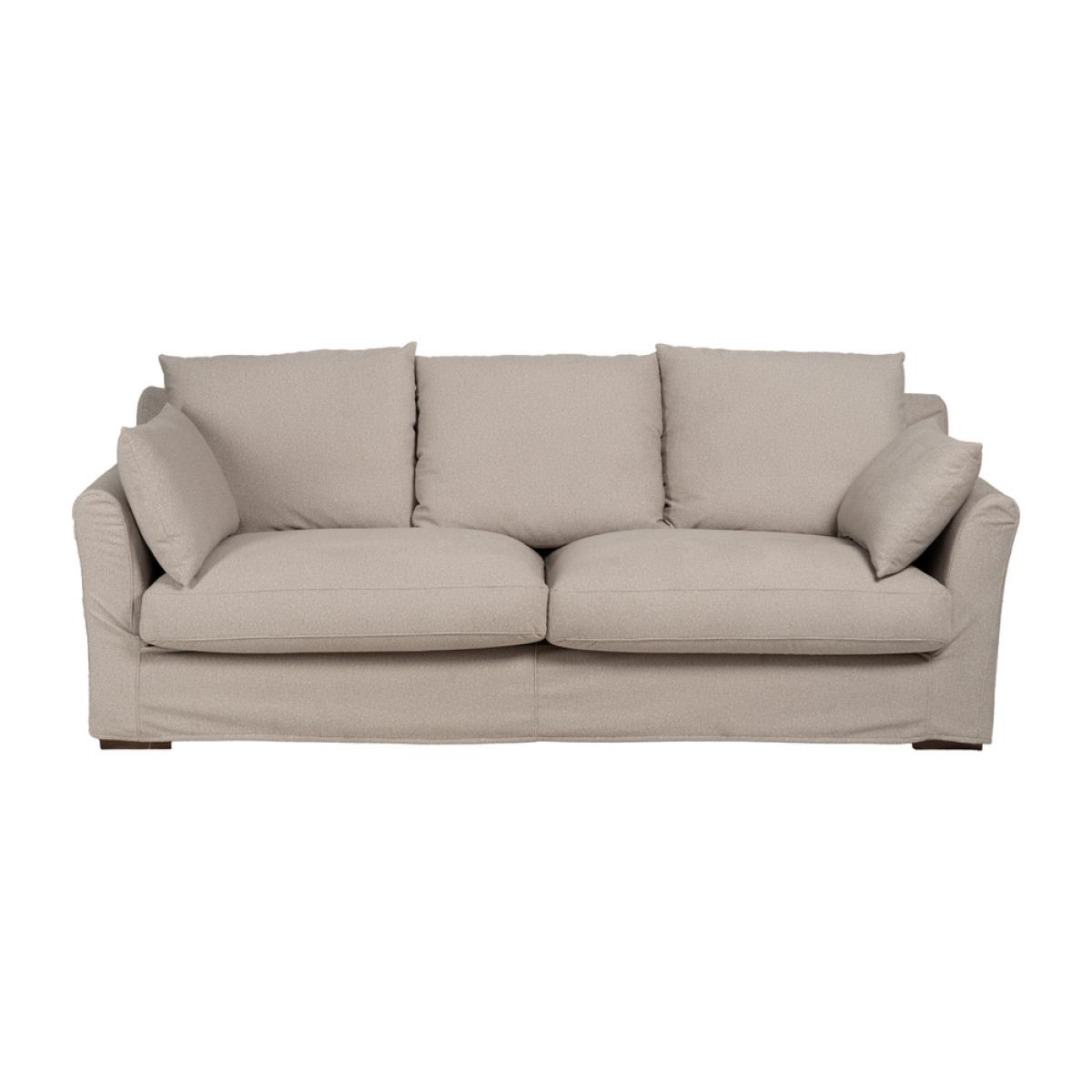 SOFÁ BEIGE TEJIDO SALÓN 245 X 102 X 100 CM Tejido: Estructura: madera de pino. Suspensión: cincha elástica Nea. Relleno: asiento de de fibra y pluma con goma de poliuretano de 30kg y respaldo de fibra siliconada y pluma. Cojines y estructura desenfundables. Altura asiento: 53cm. Ancho asiento: 210cm. Profundidad asiento: 64cm. Altura respaldo: 50cm. Altura reposabrazos: 20cm. Altura patas: 3cm.