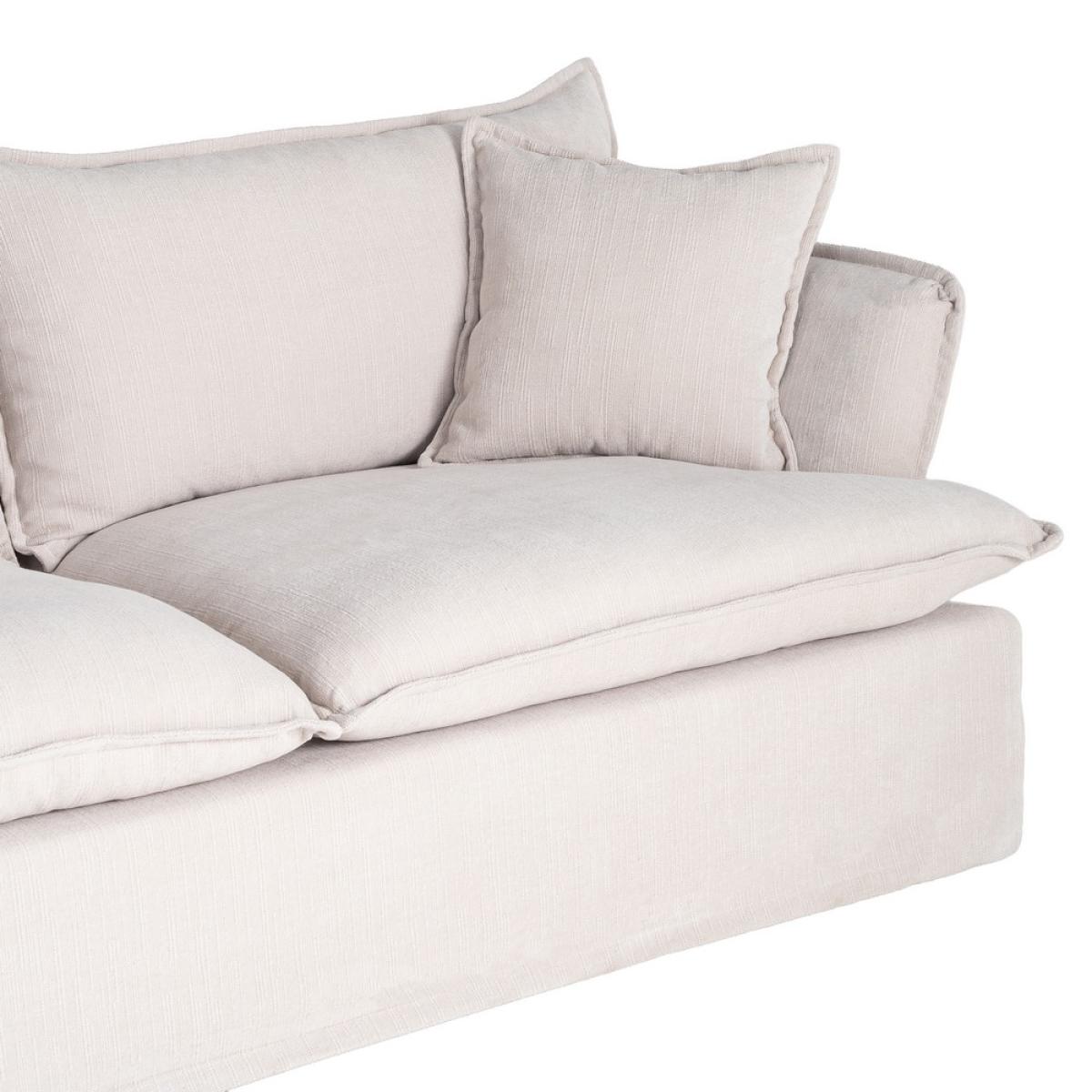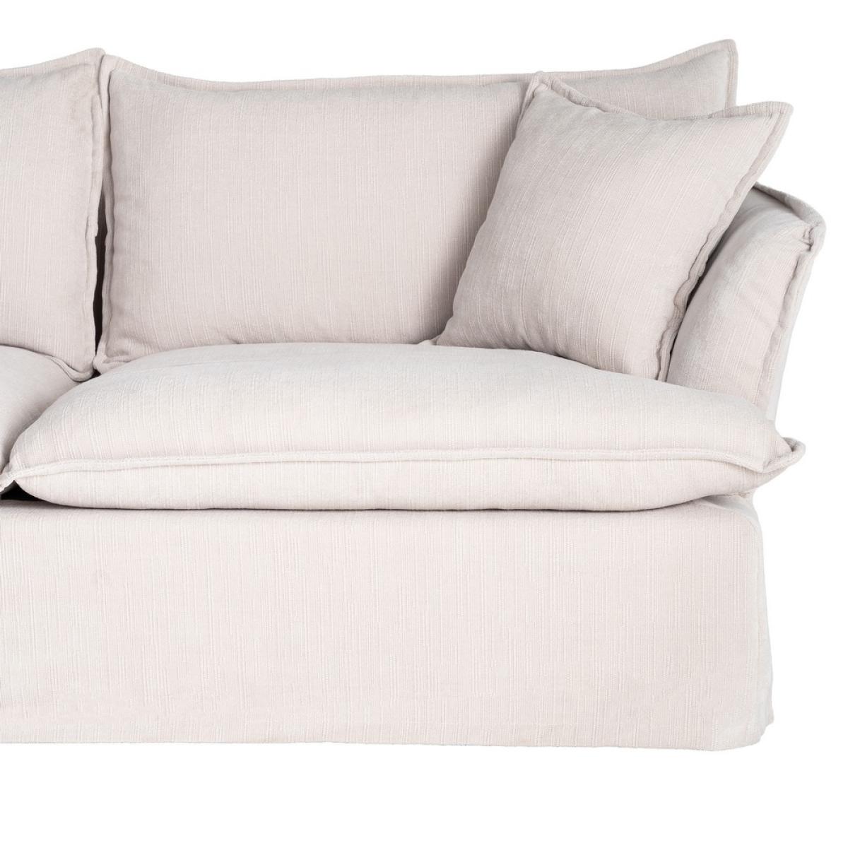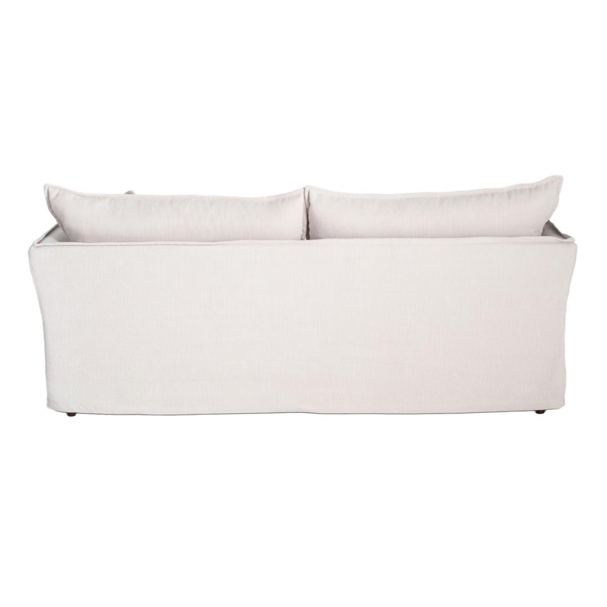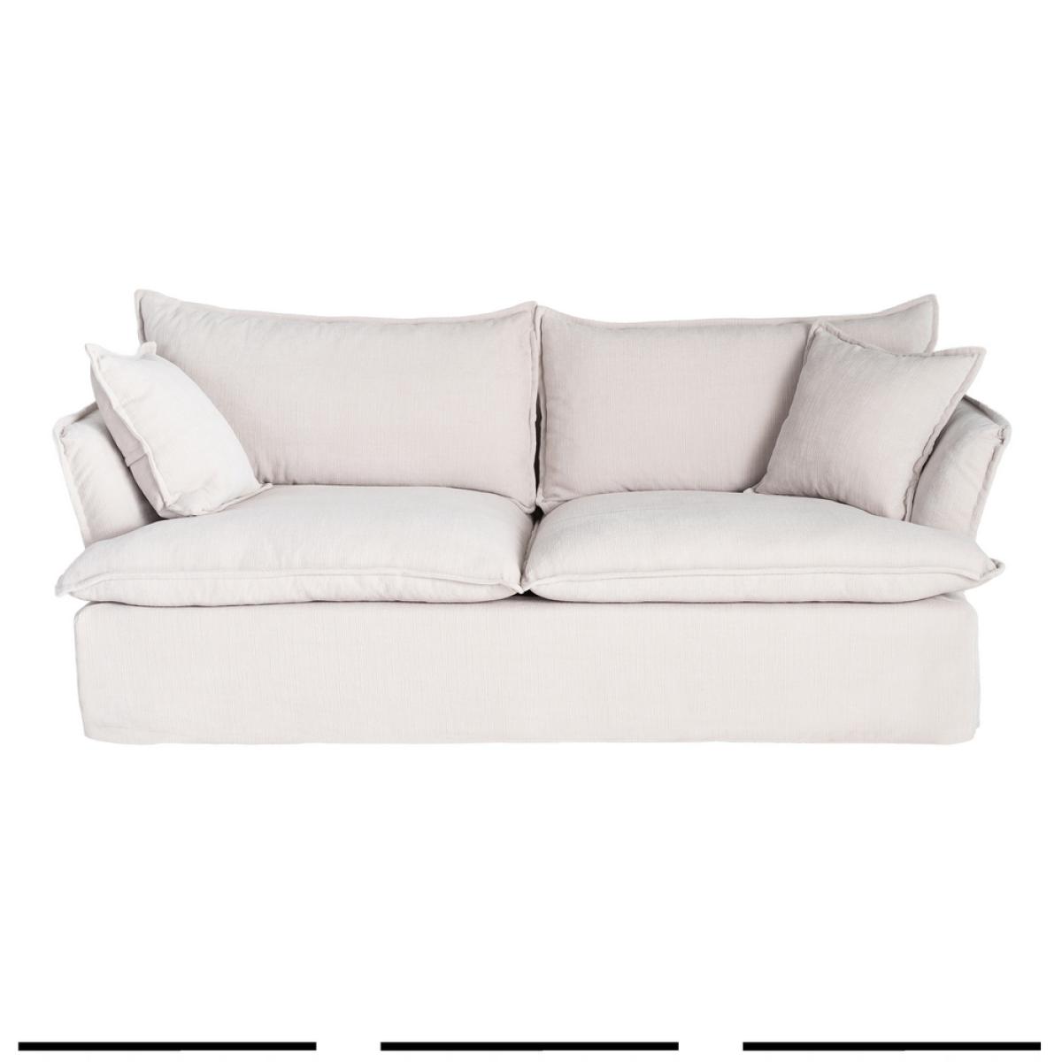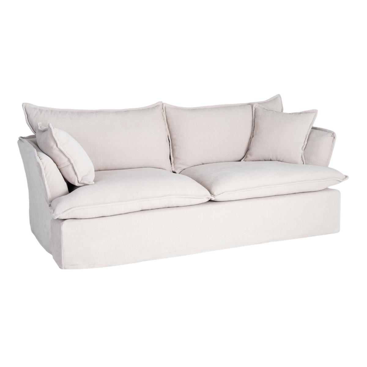 SOFÁ 3 PLAZAS CREMA TEJIDO 221 X 103 X 72 CM Material: tejido 100% poliéster Relleno asientos: doble pluma. Altura asiento: 51cm. Altura respaldo: 47cm. Patas para montar Se recomienda limpieza en seco. Sofá completamente desenfundable.