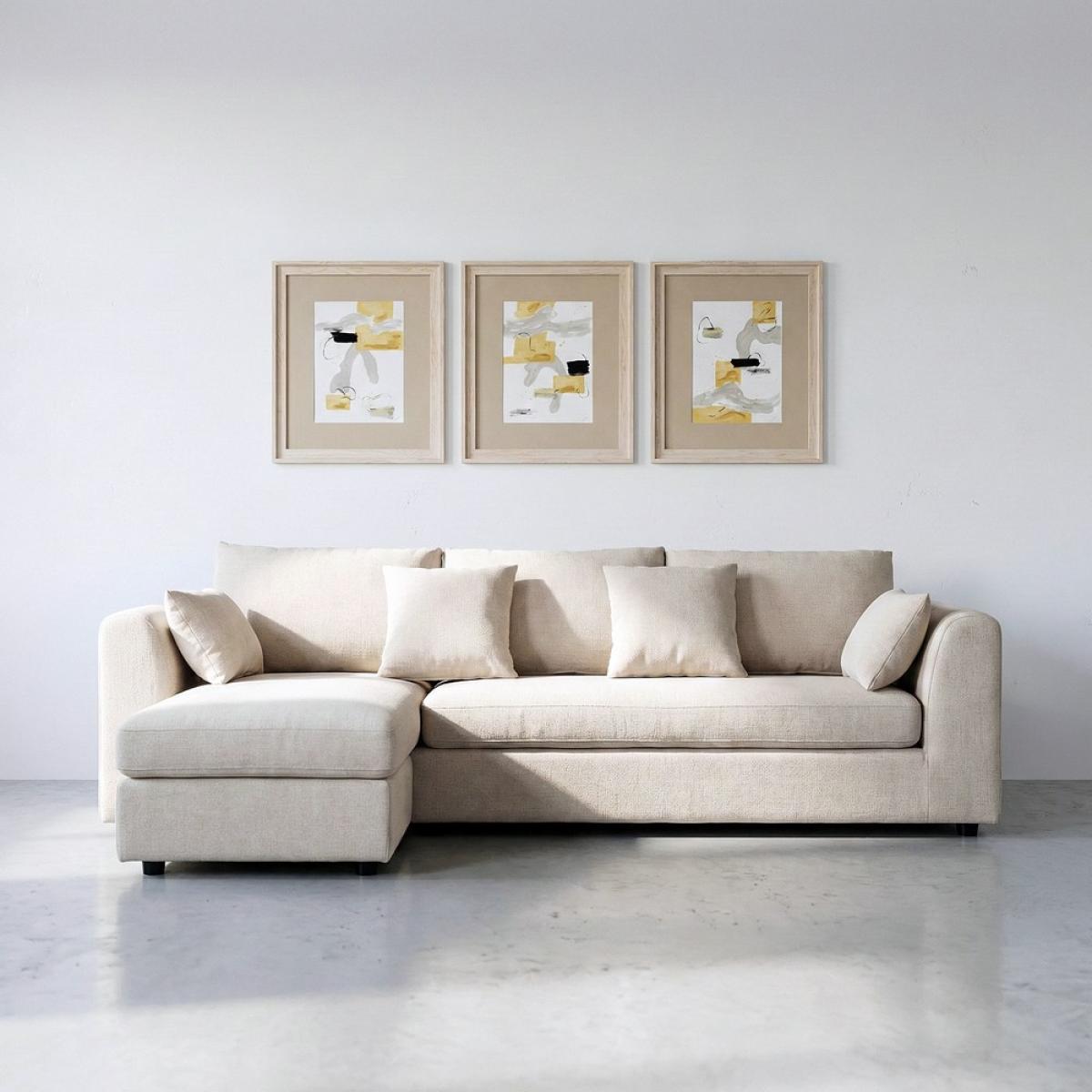 SOFÁ CHAISE LONGUE IZQ./DCHA. CREMA 260 X 164 X 76 CM Material: 100% poliéster. Patas: madera de caucho Patas para montar. Asiento: Foam 32kgr./m3. Trasera: Foam 23Kgr./m3. Respaldo: fibra. Medida cojines: respaldo 77x48 - decoración 45x45 - 54x34cm. Cojines desenfundables con cremallera. Medida sofá 3 plazas: 1.94x1.17x76cm. Medida chaise: 1.54x1.64x76cm. Altura asiento: 44cm. Ancho asiento: 217cm. Profundo asiento: 70cm. Altura respaldo: 48cm. Altura reposabrazos desde el suelo: 66cm. Cumple normativa: EN12520:2025