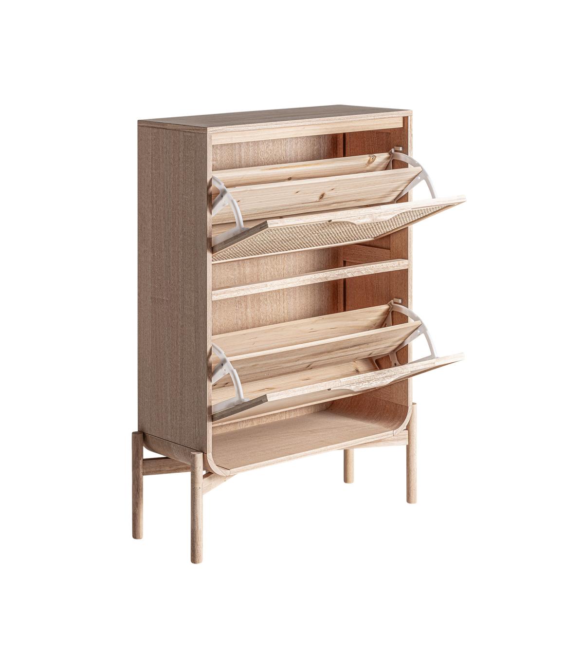 Zapatero rectangular weurtz de estilo nórdico, fabricado en madera de fresno en color marrón claro, combinado con ratán. Producto desmontable.